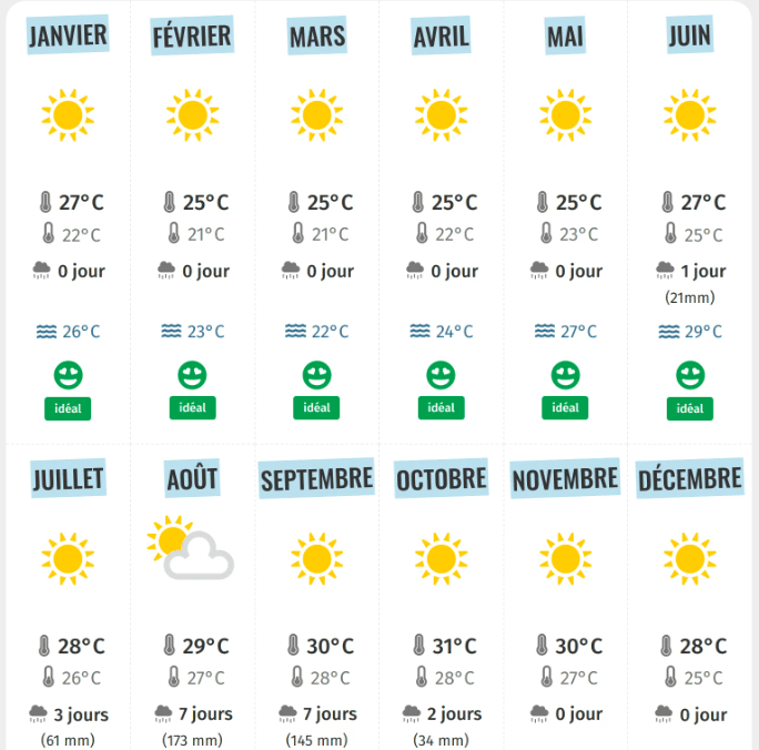 - Les températures moyennes varient entre 24°C et 32°C selon la région et la saison.