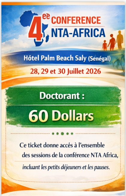 Ce ticket donne accès à l’ensemble des sessions de la Conférence NTA-Africa, ainsi qu’aux collations, incluant les petits déjeuners et les pauses-café, pendant toute la durée de l’événement.